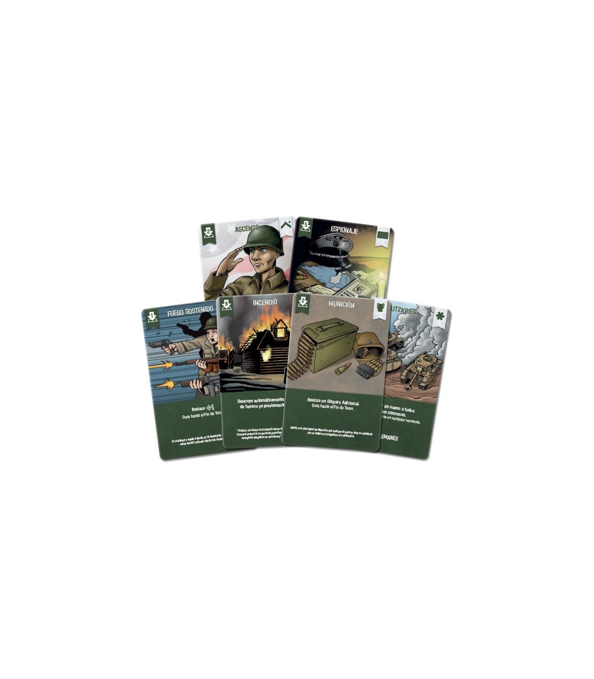 Contiene 2 dados personalizados de 10 caras, donde la cara del 10 contiene el logo de cada facción (Alemania y EE. UU.).