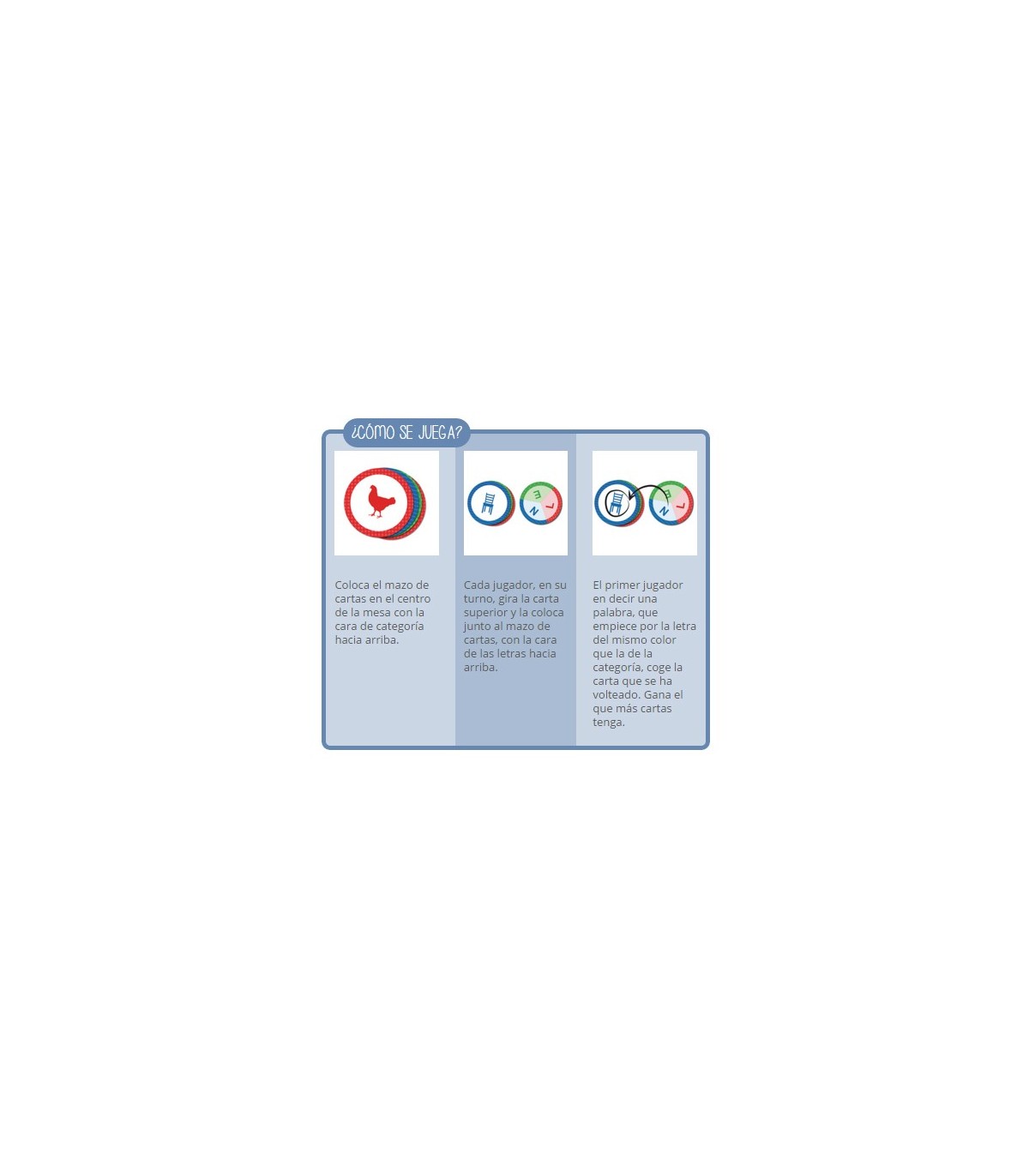Un divertido juego de cartas de doble cara. En una cara se representan las 10 categorías del juego y En la otra 3 letras de distinto color. Se el primero en encontrar una palabra de la categoría que indica la carta y que comience por la letra del mismo color. ¡Sé el más rápido y conviértete en el SUPERPALABRERO!
